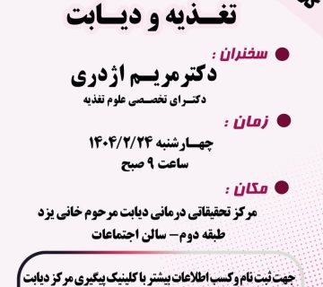 شما میتوانید جهت شرکت در کلاسهای آموزشی با کلینیک پیگیری مرکز دیابت به شماره 03537280218 تماس حاصل فرمایید.