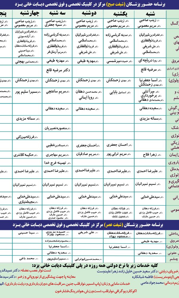 برنامه پزشکان تیرماه 1403روابط عمومی مرکز دیابت2 تیر 1403📌 برنامه حضور پزشکان در مرکز تحقیقاتی درمانی دیابت یزد در شیفت صبح ... اطلاعات بیشتر